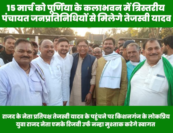 राजद के समर्थन से विधान परिषद की पूर्णिया किशनगंज अररिया की सीट पर घोषित उम्मीदवार हाजी अब्दुस सुबहान का हौसला अफजाई करने के लिए पूर्व निर्धारित कार्यक्रम के अनुसार , सीमांचल के कटिहार स्थित बीएमपी के मैदान में राजद नेता तेजस्वी यादव सोमवार14 मार्च को ही हेलीकॉप्टर से पहुंच गए और वह आज मंगलवार 15 मार्च को पूर्णिया में राजद समर्थित उम्मीदवार हाजी अब्दुस सुबहान के नामांकन के बाद पूर्णिया के कलाभवन में राजद समर्थक त्रिस्तरीय पंचायत जनप्रतिनिधियों की हौसला अफजाई करेंगे।